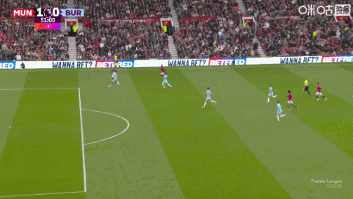 上半场伤停补时8分钟,第45+5分钟,曼联反击机会,齐尔克泽斜传,前场二打一,姆伯莫选择了传球,阿玛德面对空门的射门推射打飞了。↓